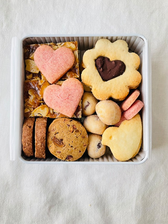 【商品名】バレンタインクッキーアソートパック(小袋詰め合わせ) プラントベース(植物性食品)、グルテンフリーの米粉クッキー詰め合わせ (ラッピング代込み) 【内容】内容量約50g×2袋 ・チョコサンドオートミールクッキー ・有機クランベリーボールクッキー ・有機レモンクッキー ・紫芋・ビーツクッキー ・有機いちじくカカオニブ入り穀物コーヒーメープルクッキー ・ココアココナッツメープルクッキー 【材料】 米粉(熊本県産)、てんさい糖、アーモンド、米油、有機豆乳、片栗粉、有機コーンスターチ、有機ココナツオイル、有機メープルシロップ、おからパウダー、有機オートミール、有機レモン、有機ココナツ、有機カカオパウダー、紫芋パウダー、有機ドライクランベリー(有機クランベリー、有機砂糖、有機ひまわり油)、有機ドライいちじく、カカオニブ、有機ローカカオバター、有機ローカカオパウダー、有機穀物コーヒー、食塩、有機シナモン/ベーキングパウダー(一部に大豆・アーモンドを含む) 【賞味期限】2026.2.25 【配送方法】順次発送します。 ※ご希望の受け取り時間がございましたら備考欄にご記入下さい(午前中、14-16、16-18、18-20、19-21) ※クッキー缶のみのご注文はクロネココンパクト常温便での発送となります。 ※到着後は冷凍または冷蔵庫保管していただくとおいしさを保ちやすくなります。 ※クッキーの割れが発生する可能性がございます。また、内容量は変わりませんが写真と盛り付けやシールの色が異なることがございますのでご了承下さい