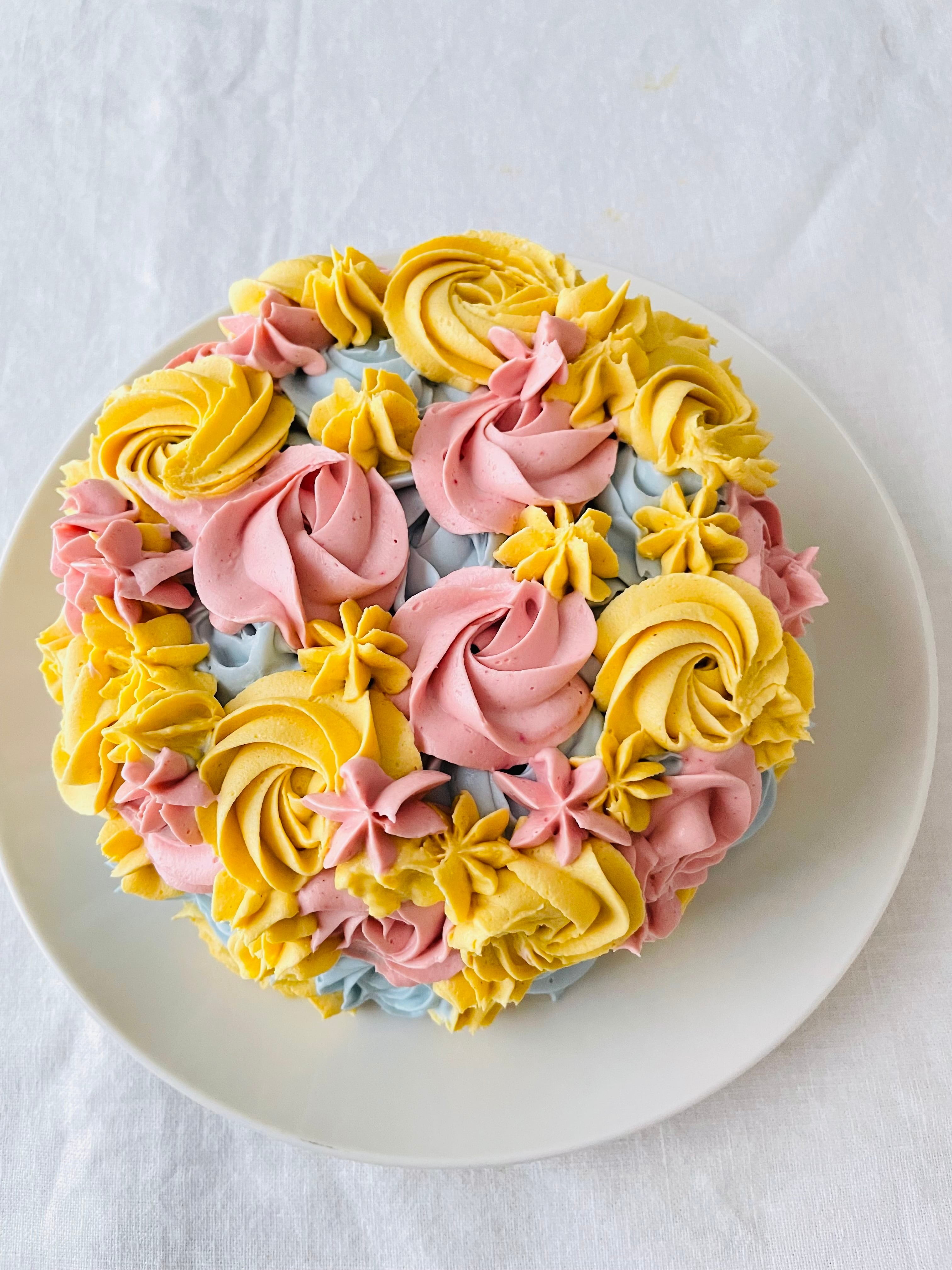 トッピングにはビーツ、いちご、抹茶、リナブルー入りのレモンカシューローホイップクリームをお花のように絞りました。