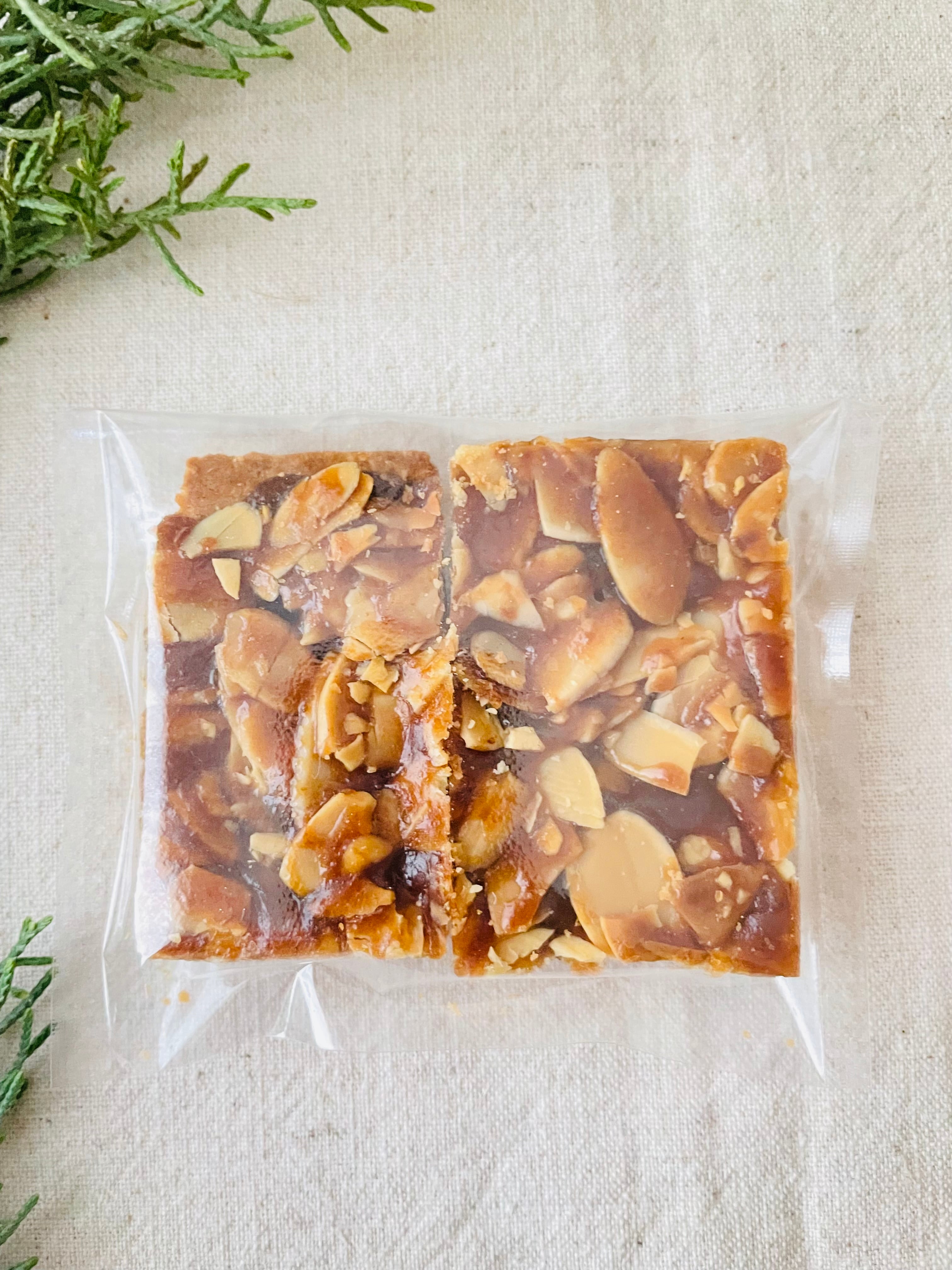 オートミール米粉クッキーにアーモンド、水飴や豆乳で作るカラメルソースをのせ焼きあげたカリっと香ばしいクッキーです。食べ応えがあり、食物繊維やビタミンEなど栄養補給もできます。