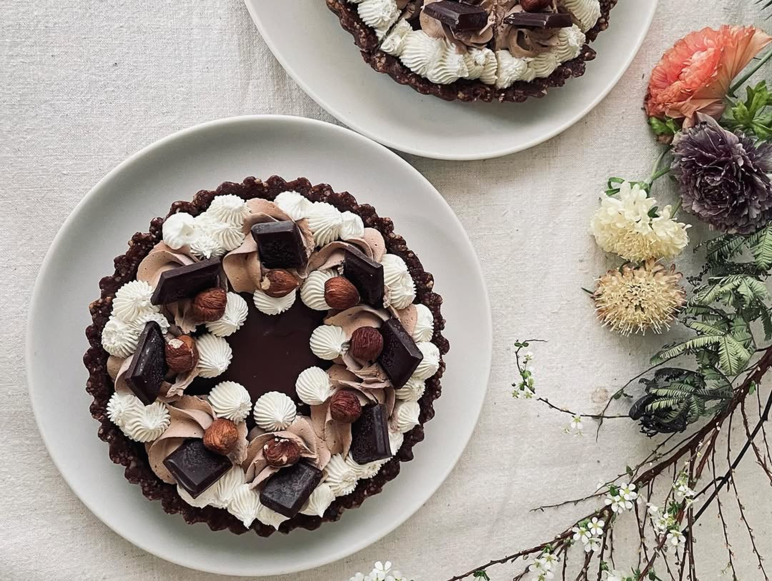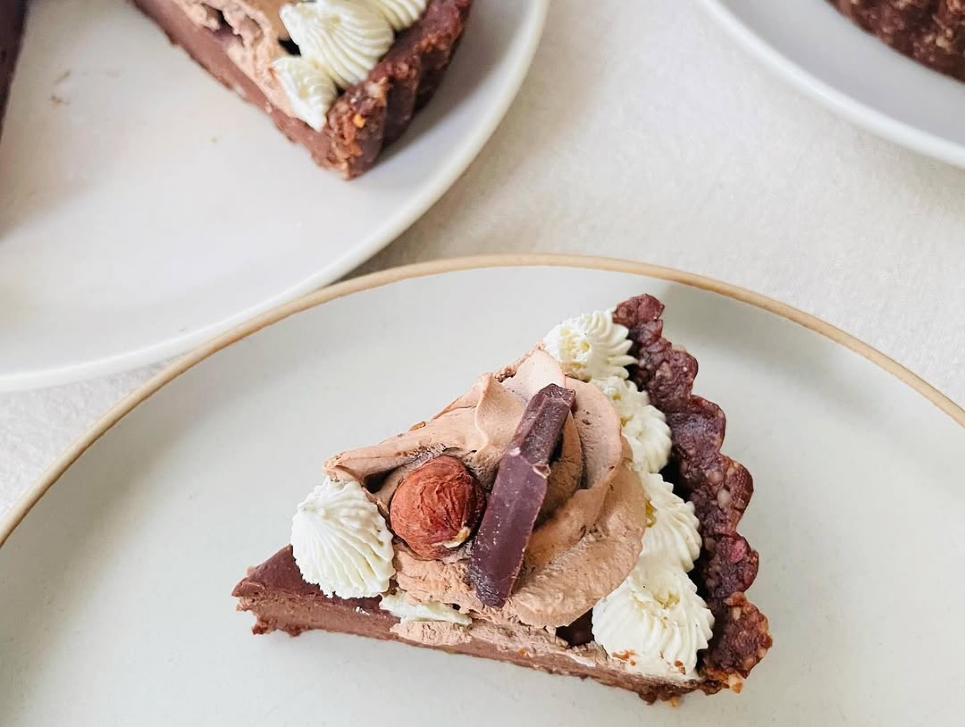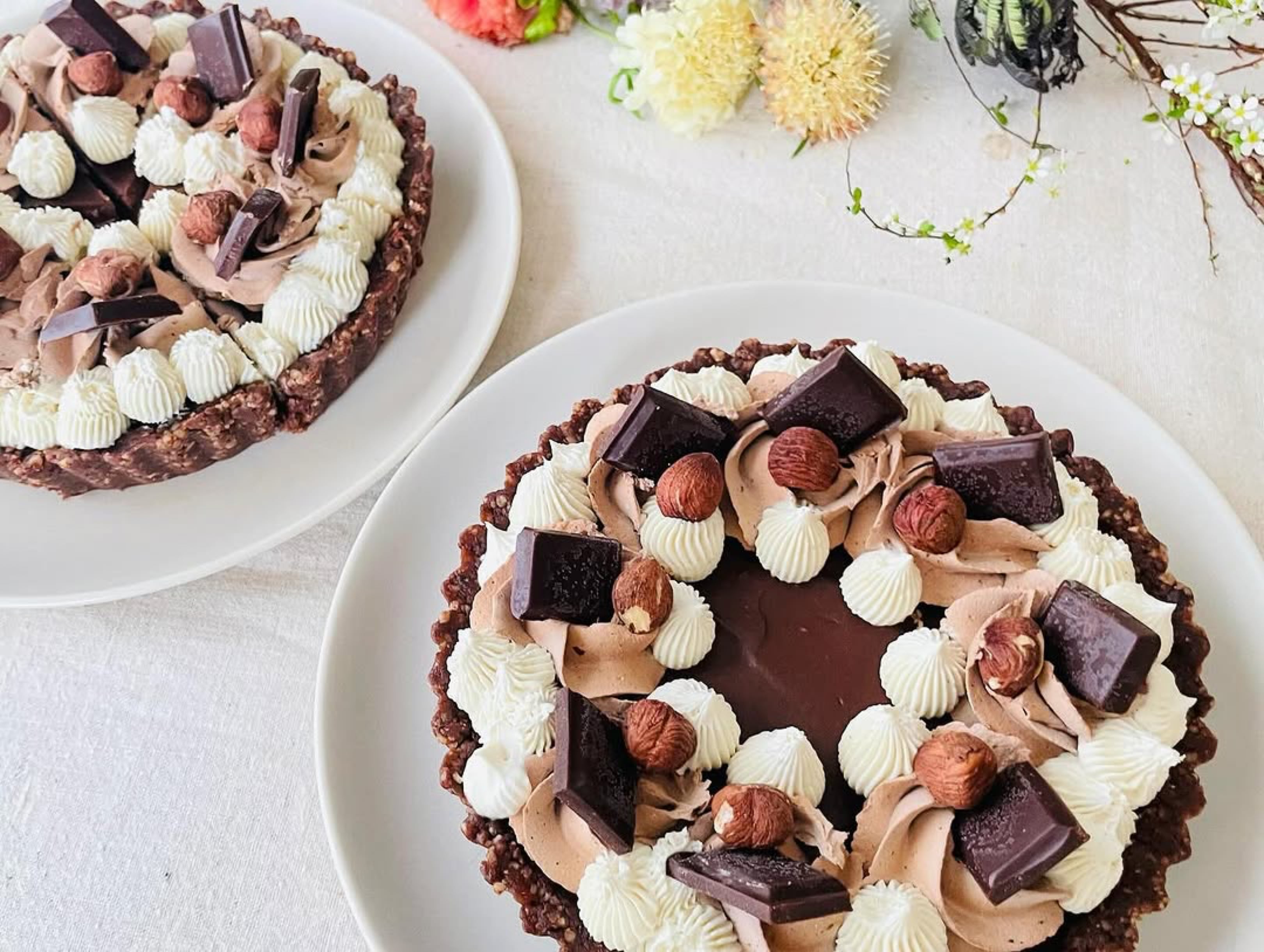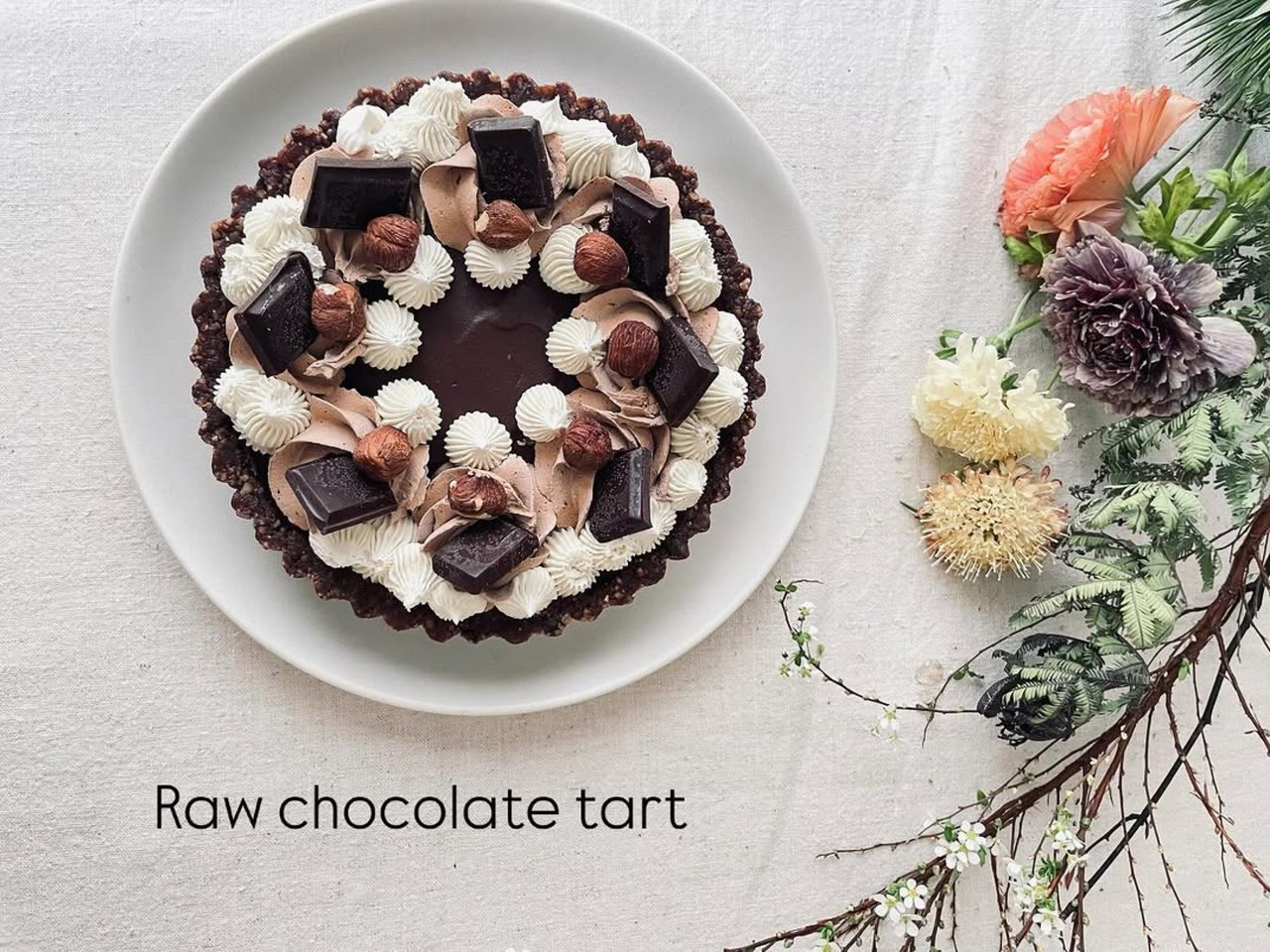 有機デーツと有機生クルミ・アーモンド、有機ローカカオパウダーの焼かないタルト生地に、有機デーツ入りガナッシュクリームを重ね、有機生カシューナッツと有機メープルシロップ、有機ココナツオイルを使用したカシューナッツホイップチョコクリームとバニラクリームをデコレーションし、自家製ローチョコレートと有機ヘーゼルナッツを飾りました。